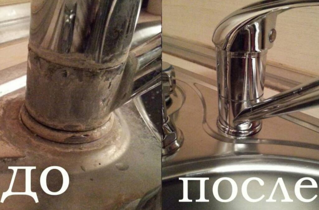 Чтобы удалить налет с кранов и сантехники, следует нанести на проблемные места густую кашицу из картофельного крахмала с ацетоном. Оставить на четверть часа и смыть губкой.